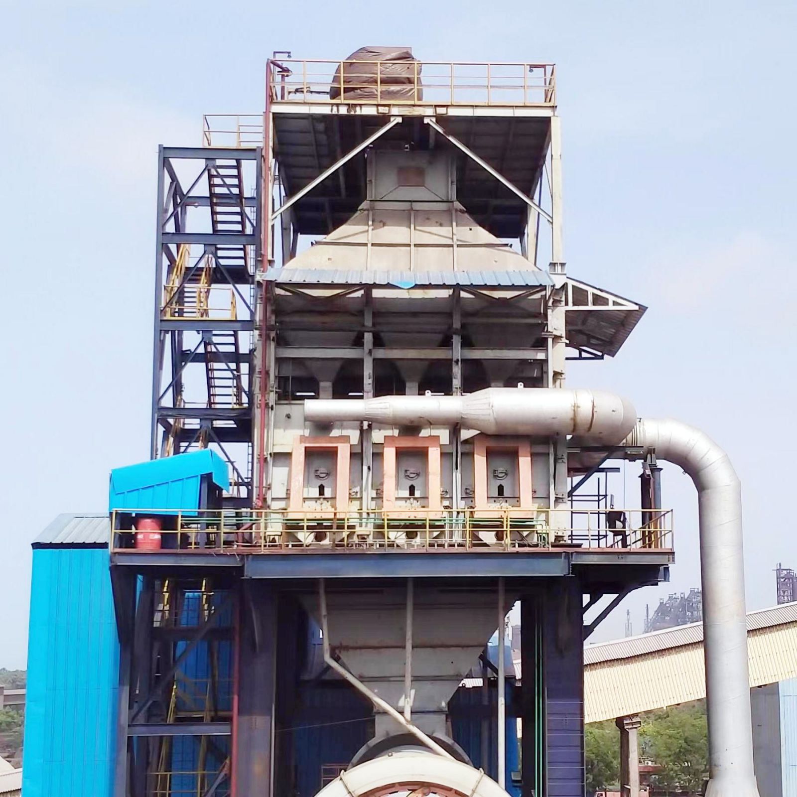 豎式預熱器和豎式冷卻機為河南鄭礦機器專利技術產品,具有入窯物料預熱效率高和出窯石灰冷卻效率高等特點,產品單耗底、節能,節省場地面積。石灰活性高,白度好,均勻穩定。窯尾出預熱器廢氣采用機力空冷機,大幅降低入收塵器廢氣溫度,同時布袋收塵器入口加裝冷風口,做應急使用,防止異常情況下高溫氣體燒壞收塵濾袋。